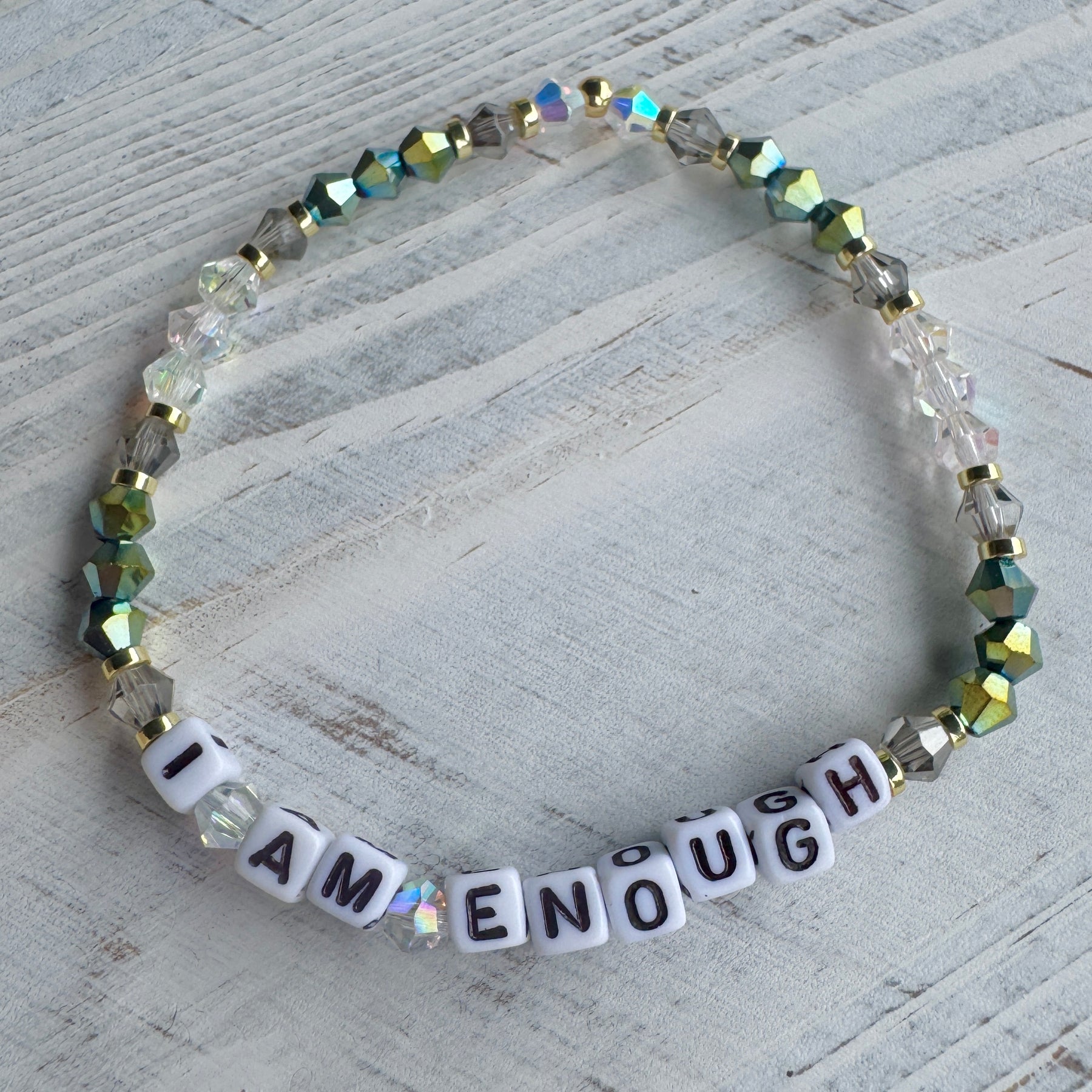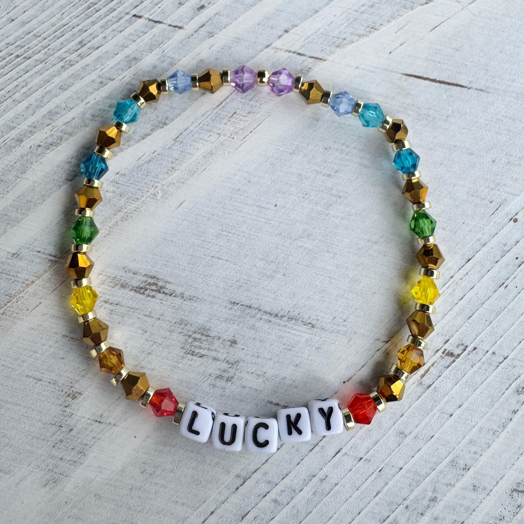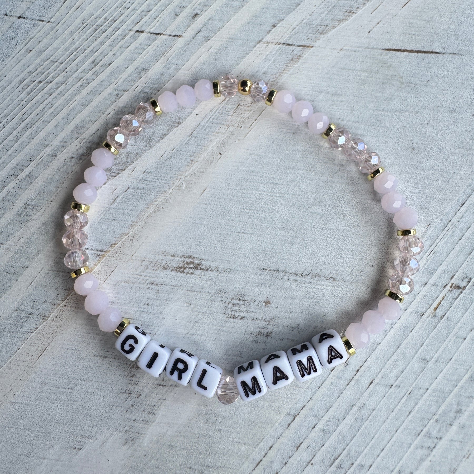 Dainty beads and contrasting chunky square letters make these bracelets stand out when mixed in with other jewellery as part of a stack.