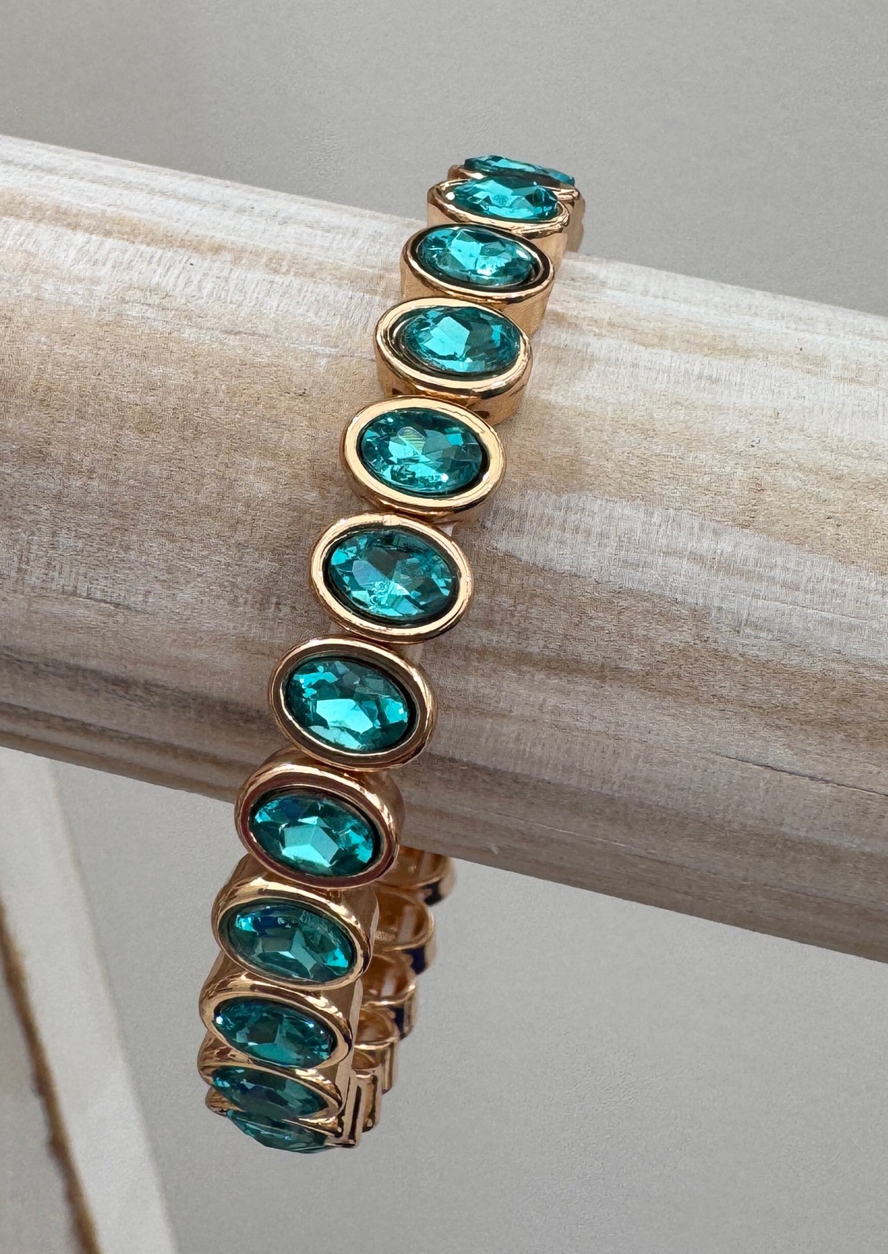Featuring a row of oval-cut jewels set in gold-plated casing, this stretchy beauty slips on effortlessly and shines all day (or night).