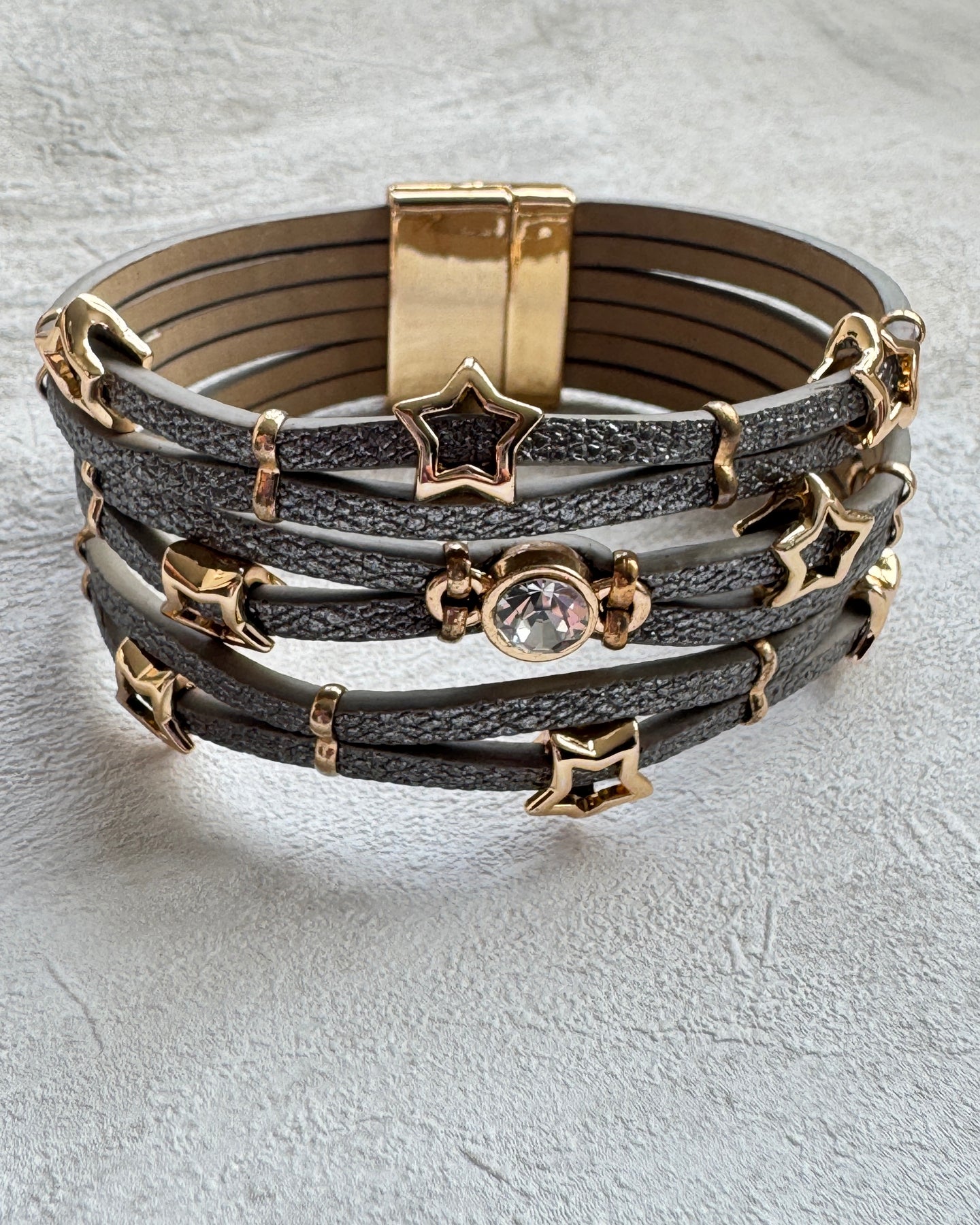 Stacked style, simplified. The Starlight Boho Cuff gives you the look of layered bracelets in one easy piece. Crafted from leather strips with delicate gold cut-out stars, it’s finished with a secure magnetic clasp for effortless wear.