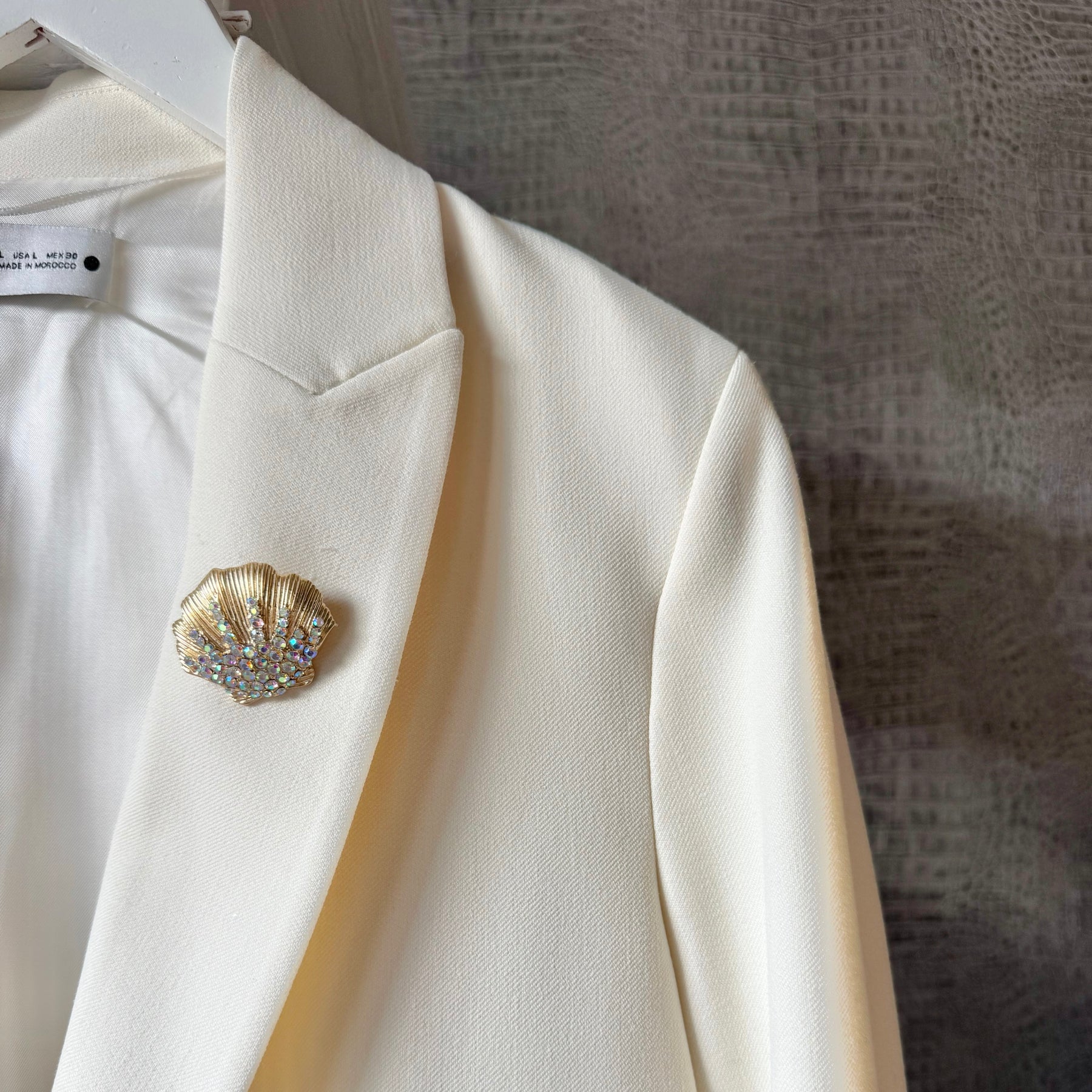 Inspired by the sea and made to shimmer — this gold-coloured scallop shell brooch is finished with iridescent crystals that catch the light beautifully.