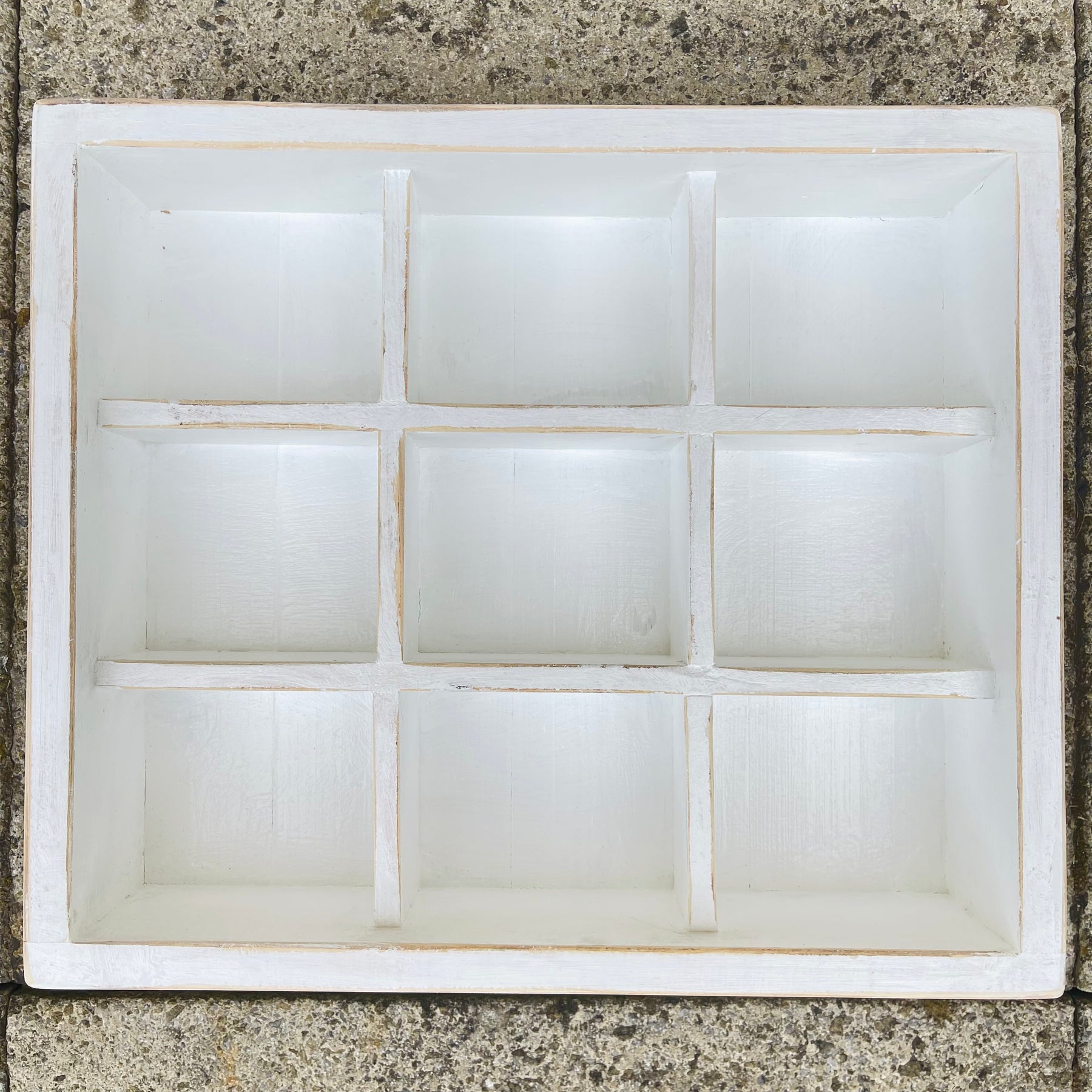 Distressed white-wash wood display tray divided into 9 square compartments
