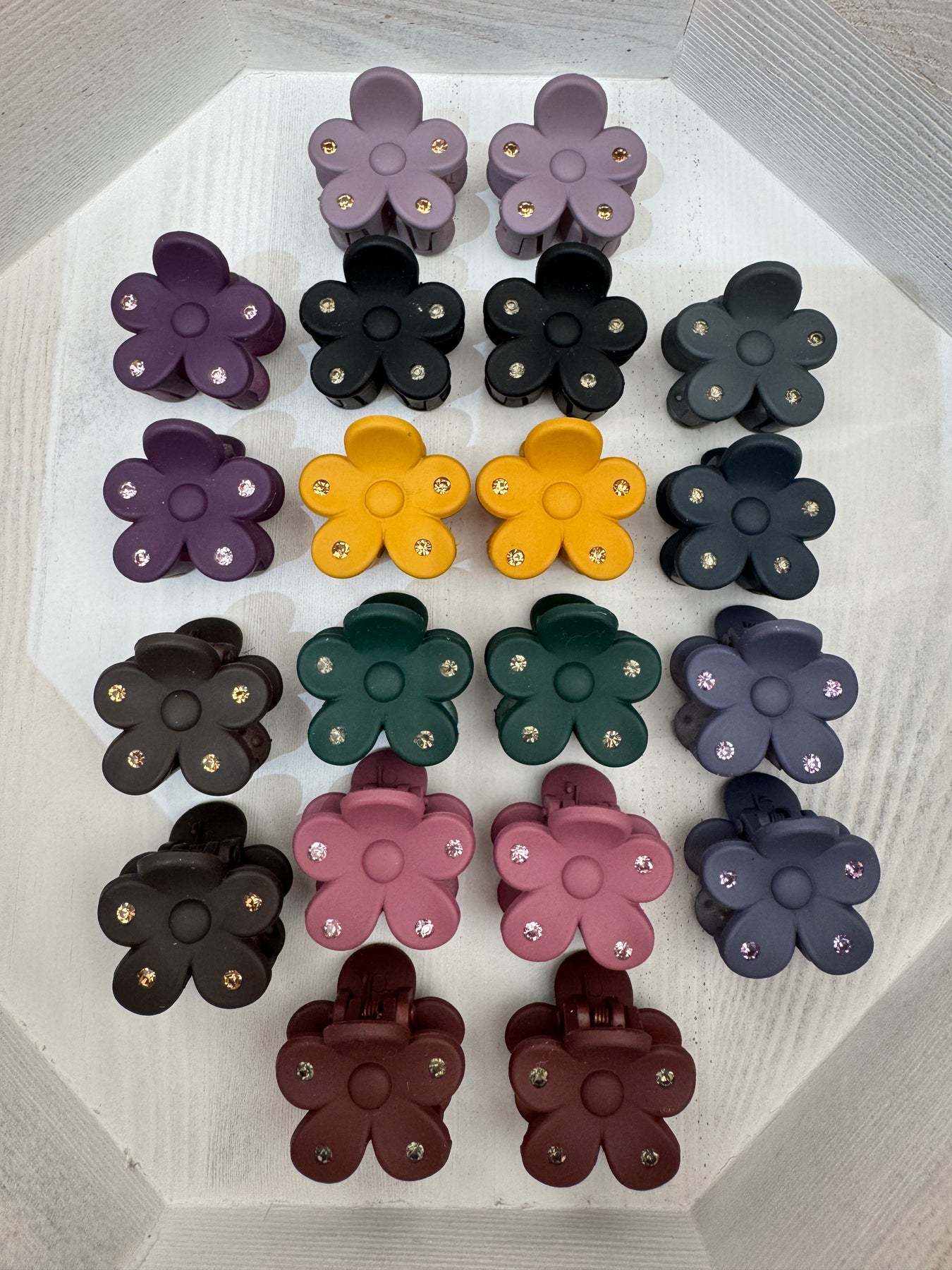 A fresh twist on a proven bestseller - now in rich autumn tones with a subtle sparkle. This pack of 20 mini flower claw clips features seasonal hues accented with dark grey crystals, adding a touch of chic to your customers’ everyday hair styling.
