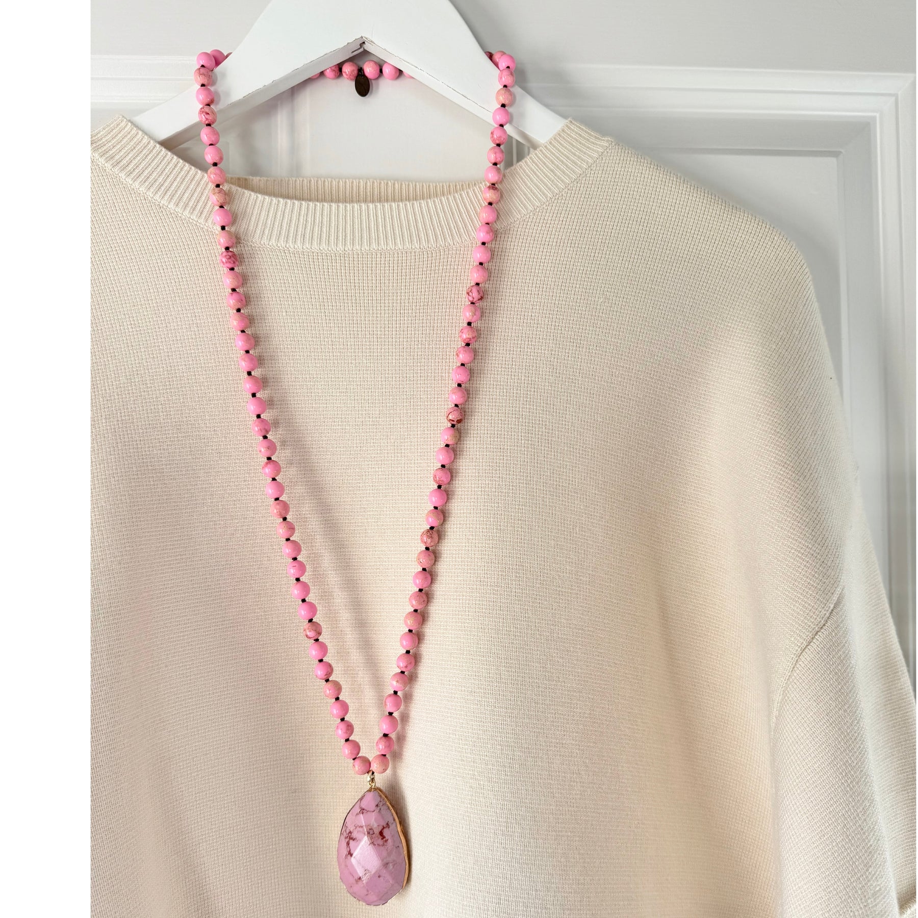 The Flamingo necklace is a stunning piece made with a pink Jasper beads & a large central pendant.