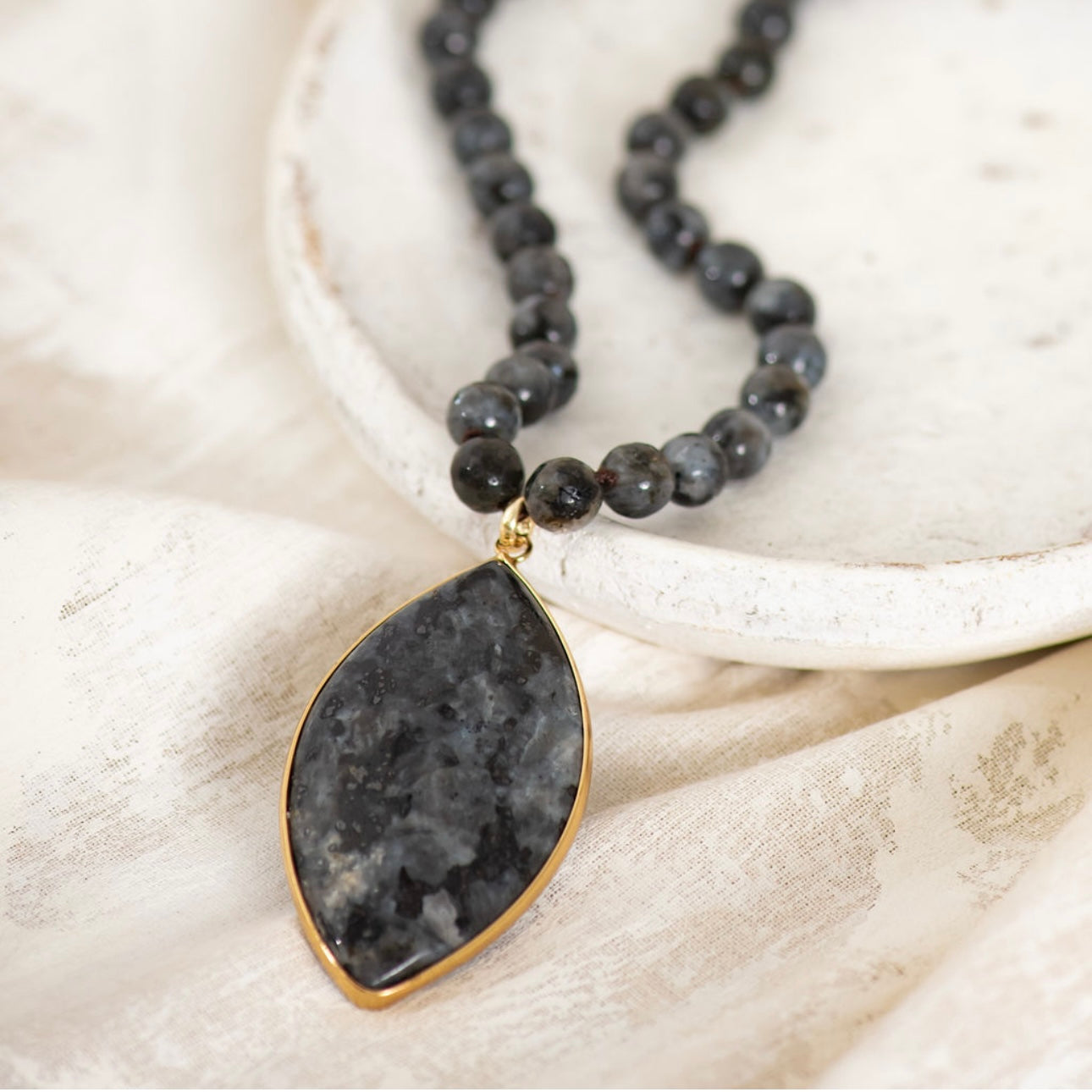 The Midnight Necklace combines natural stone and crystal beads with a captivating oval black labradorite pendant – dark and moody with flashes of iridescent light that catch the eye.