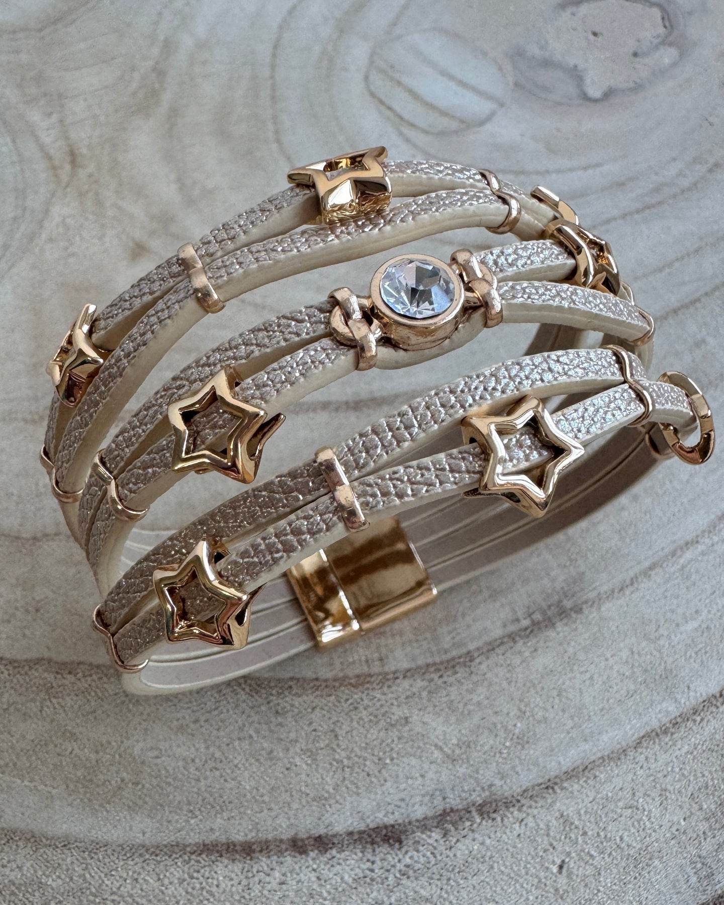 Stacked style, simplified. The Starlight Boho Cuff gives you the look of layered bracelets in one easy piece. Crafted from leather strips with delicate gold cut-out stars, it’s finished with a secure magnetic clasp for effortless wear.