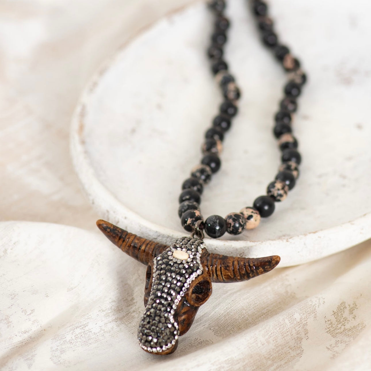 A bestseller that radiates power and poise. The Buffy Necklace is crafted from smooth black jasper beads, finished with a dazzling crystal buffalo head pendant and a striking white third eye.