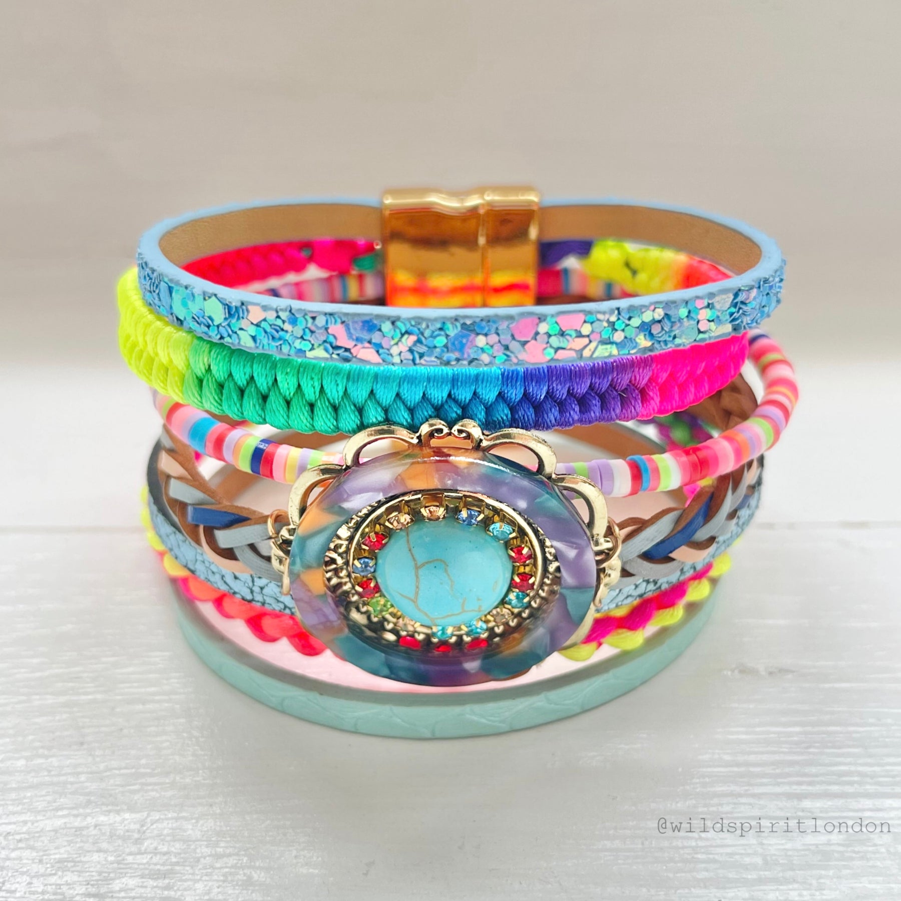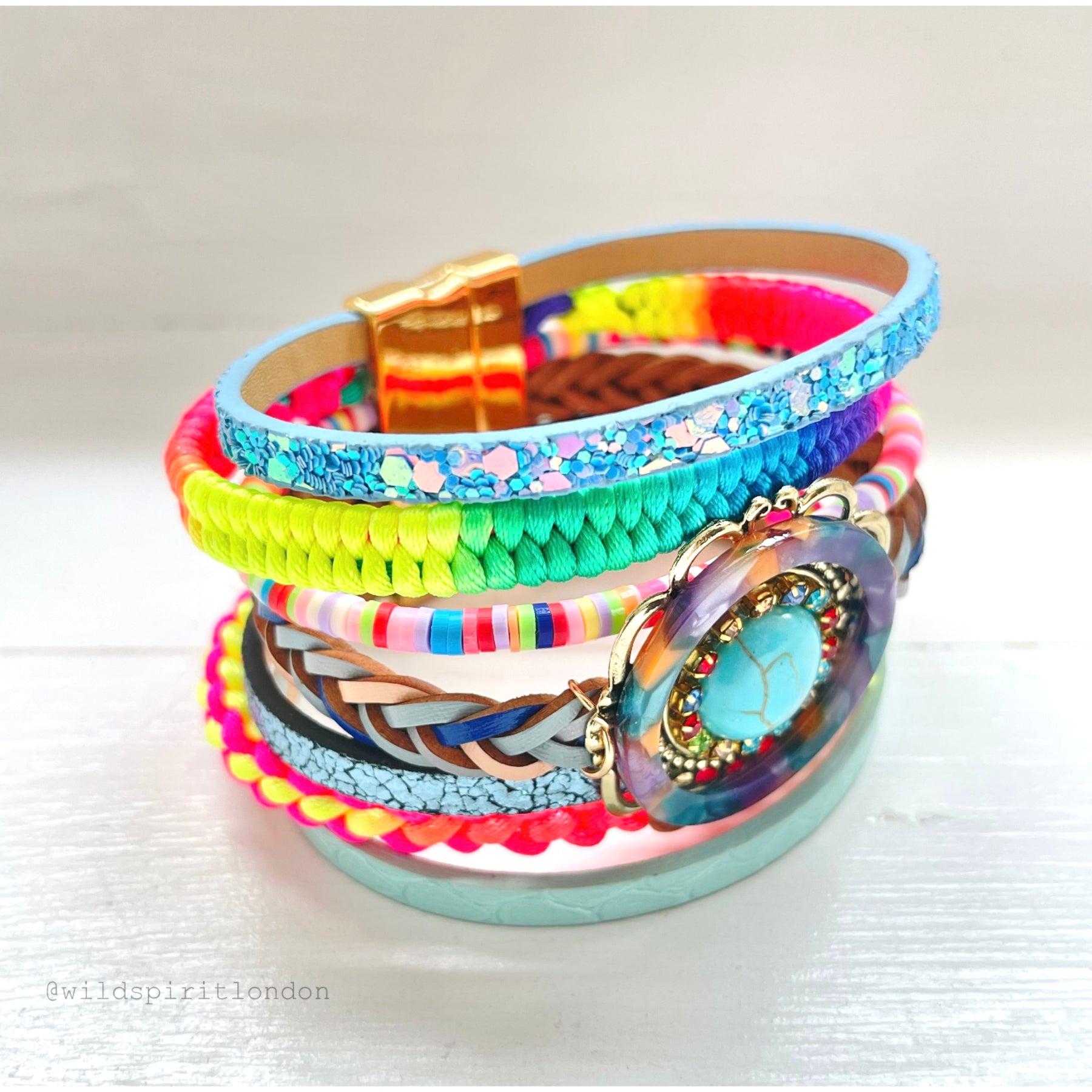 Why stack when you can slay in one effortless piece? This bold, neon-blend boho cuff gives you that layered, festival-ready look without the hassle. A mix of woven textures and luxe leather creates the perfect fusion of colour and style—like a stack of bracelets in one easy-to-wear design.