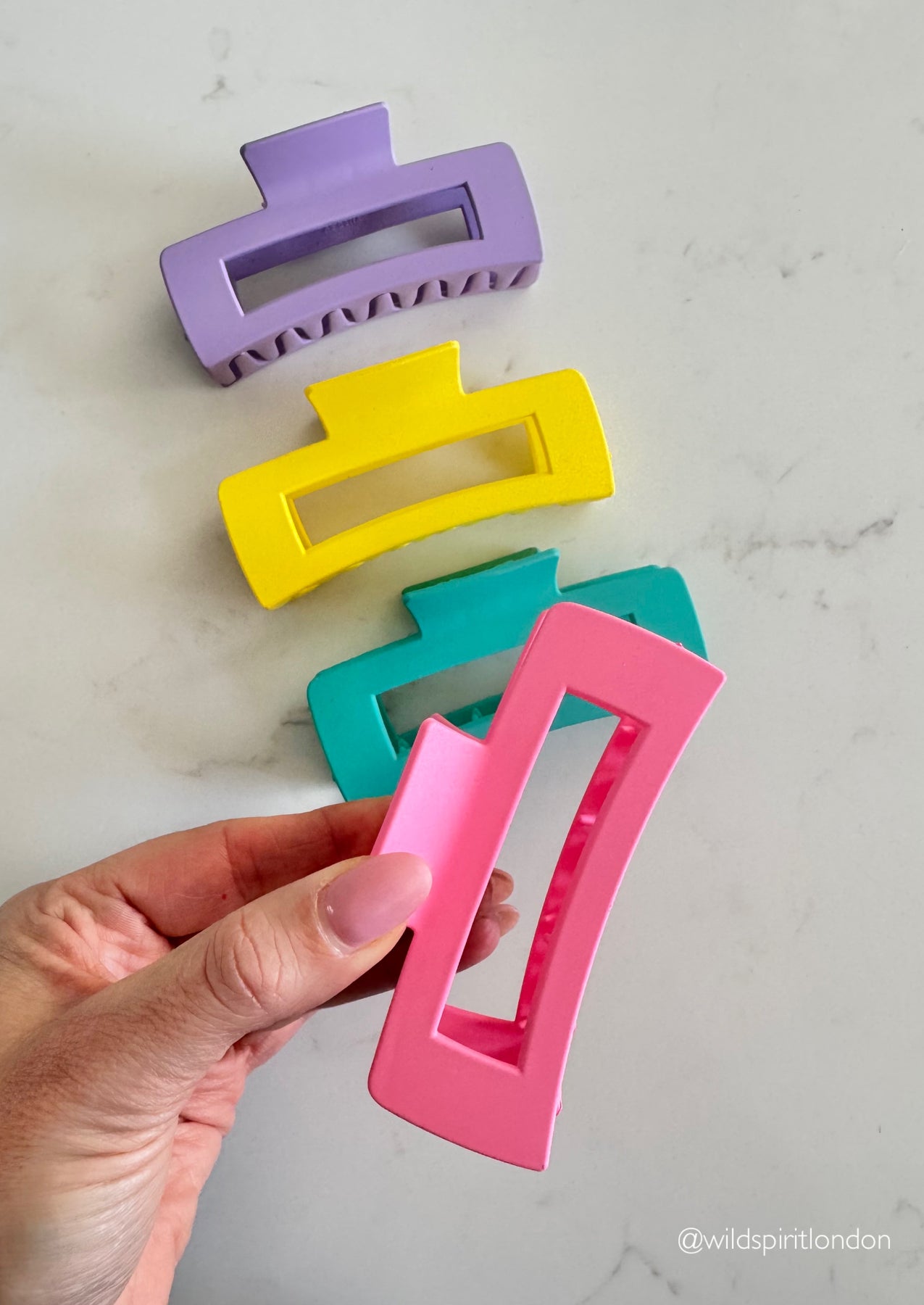 This pack of 4 large rectangular hair claws comes in a mix of bold, bright colours for serious shelf appeal and easy everyday styling.