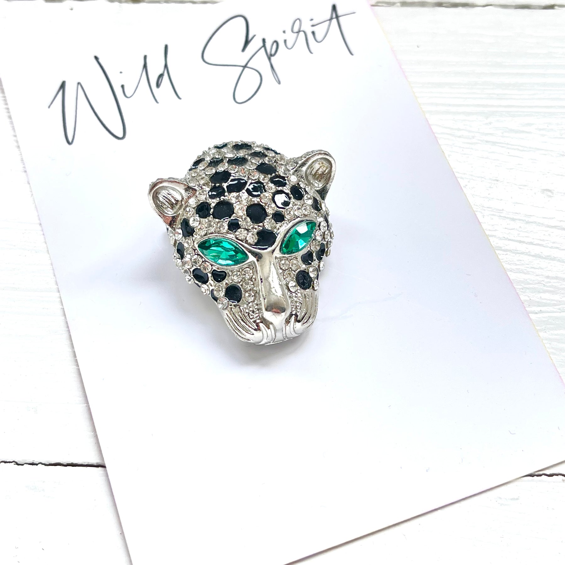 A striking statement piece that flies off the shelves. This bold cheetah head brooch features vivid green eyes and intricate detailing — perfect for customers who love to stand out.