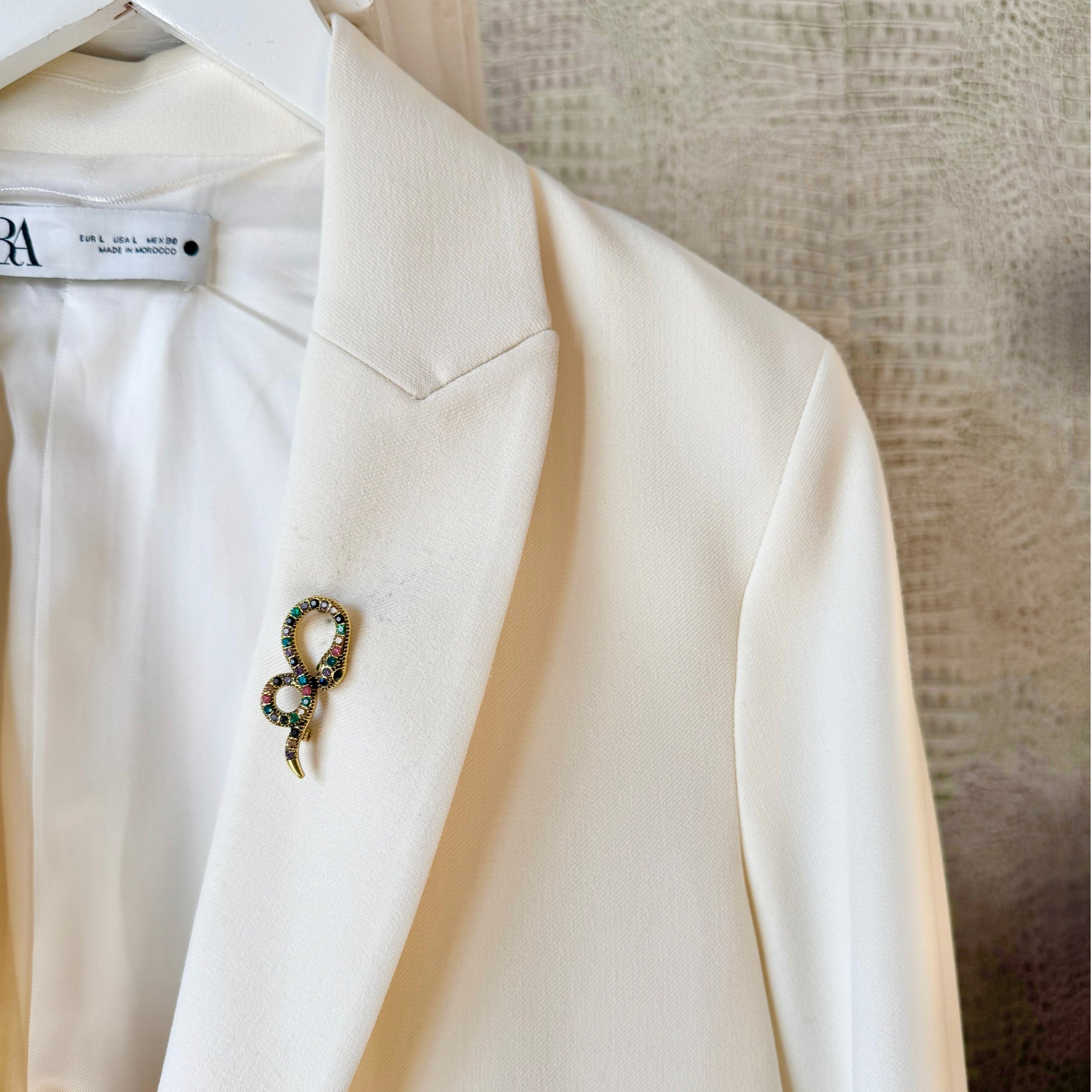 Unleash your wild side with this stunning bejewelled snake brooch. Encrusted with shimmering crystals, this sleek serpent weaves elegance and edge into any outfit. Pin it to your blazer, scarf, or handbag for an instant touch of mystique and glamour. A symbol of power, transformation, and timeless style—this little gem is destined to slither its way into your favourites.