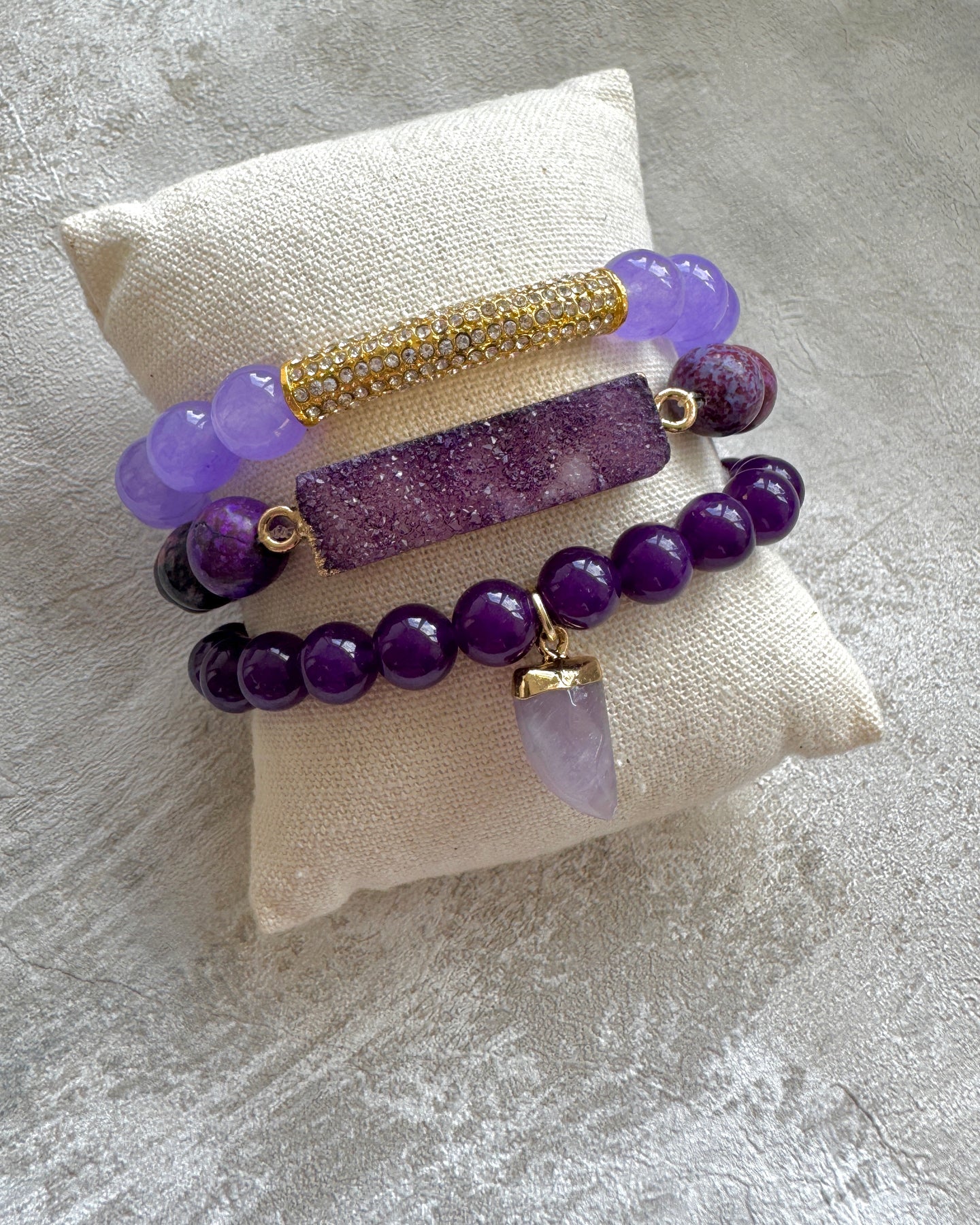 The Purple Haven Stack brings a mystical, luxe energy to your everyday look – with a mix of purple-toned natural stones, a sparkling druzy centre, and a bold agate horn pendant for a statement finish.