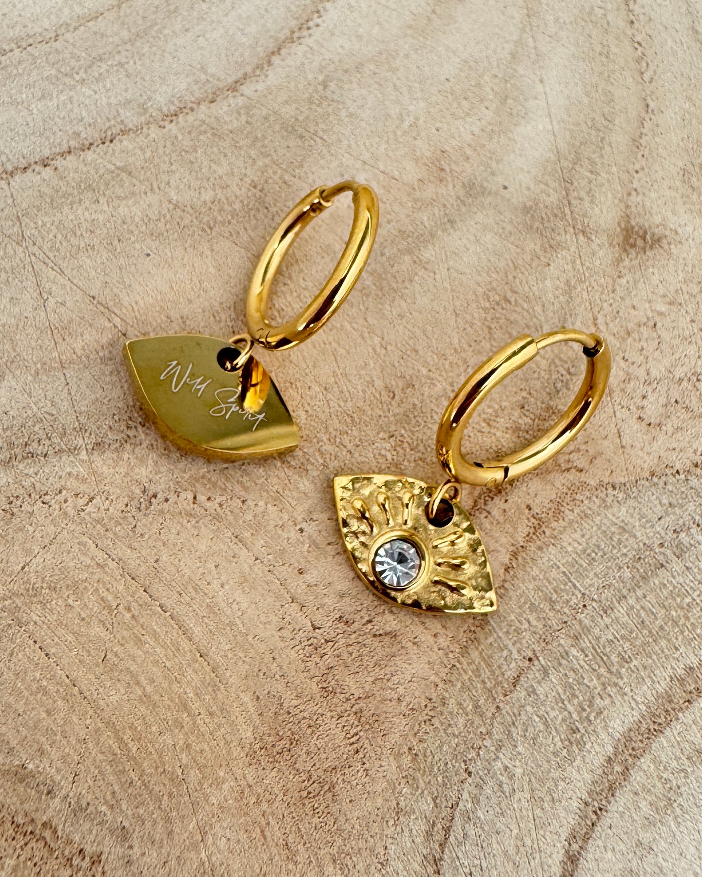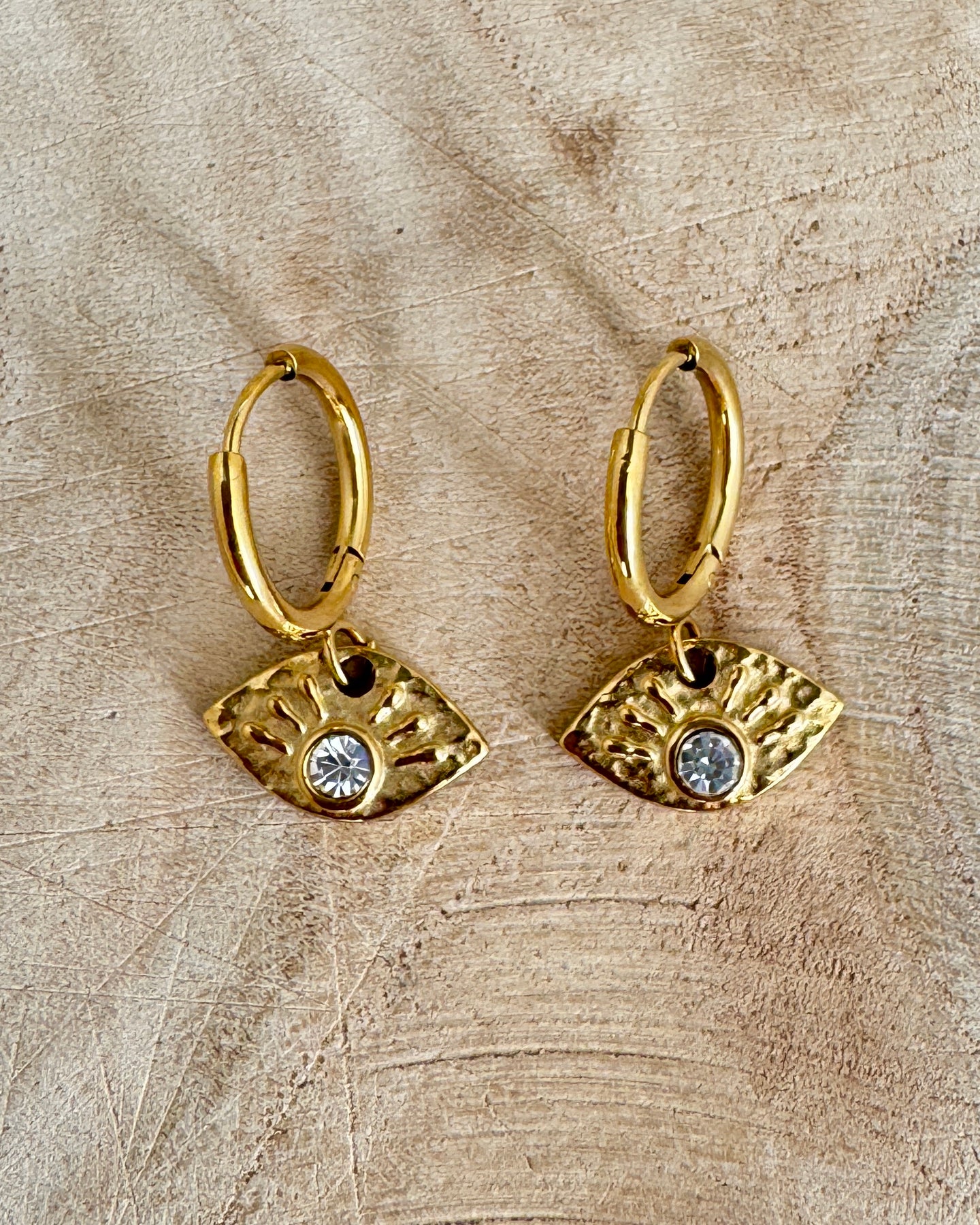 🌞 Oval charm with radiant sunray design ✨ Central crystal for that soft, sunny sparkle 💫 Small hoop style – perfect for stacking or solo wear 🌟 Waterproof 18k gold-plated stainless steel