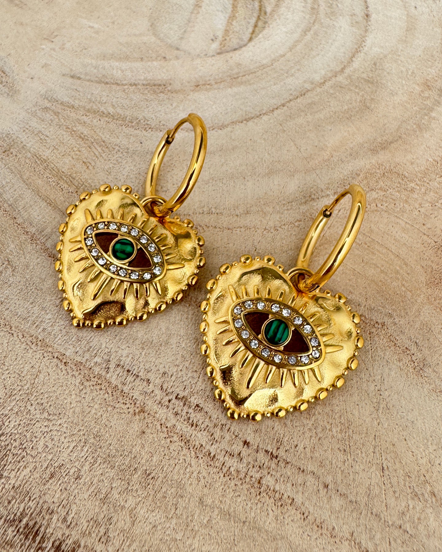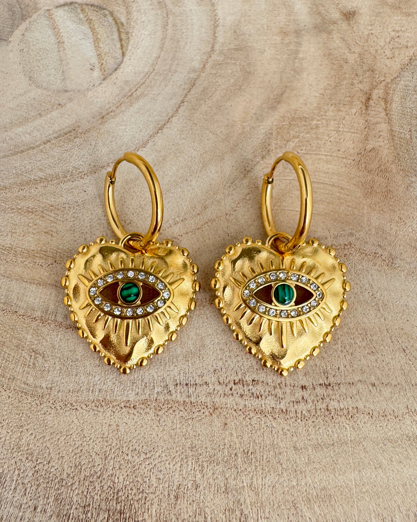 Enchanted Gaze brings together protection, power, and a touch of wild romance. These standout gold-plated hoops feature a heart-shaped malachite drop, centred with a sparkling evil eye — a symbol of intuition, strength & soulful energy.
