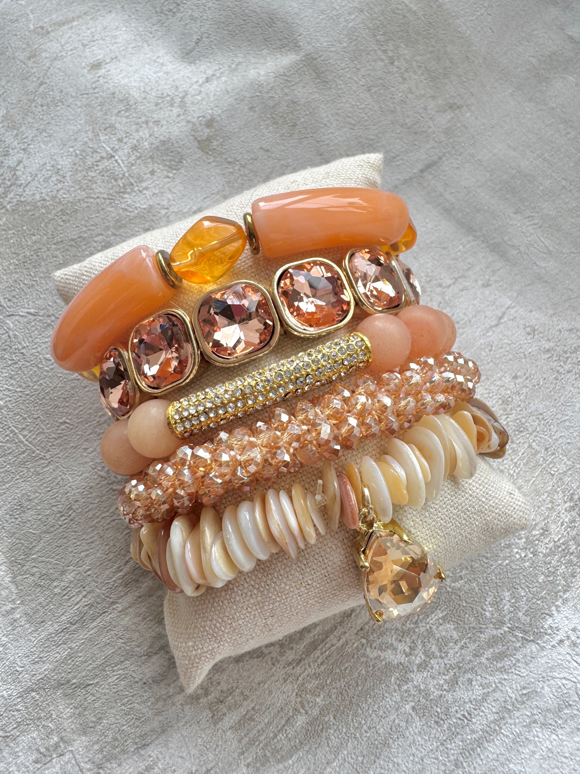 A beautiful set of 5 bracelets in blush, cream & peachy tones.