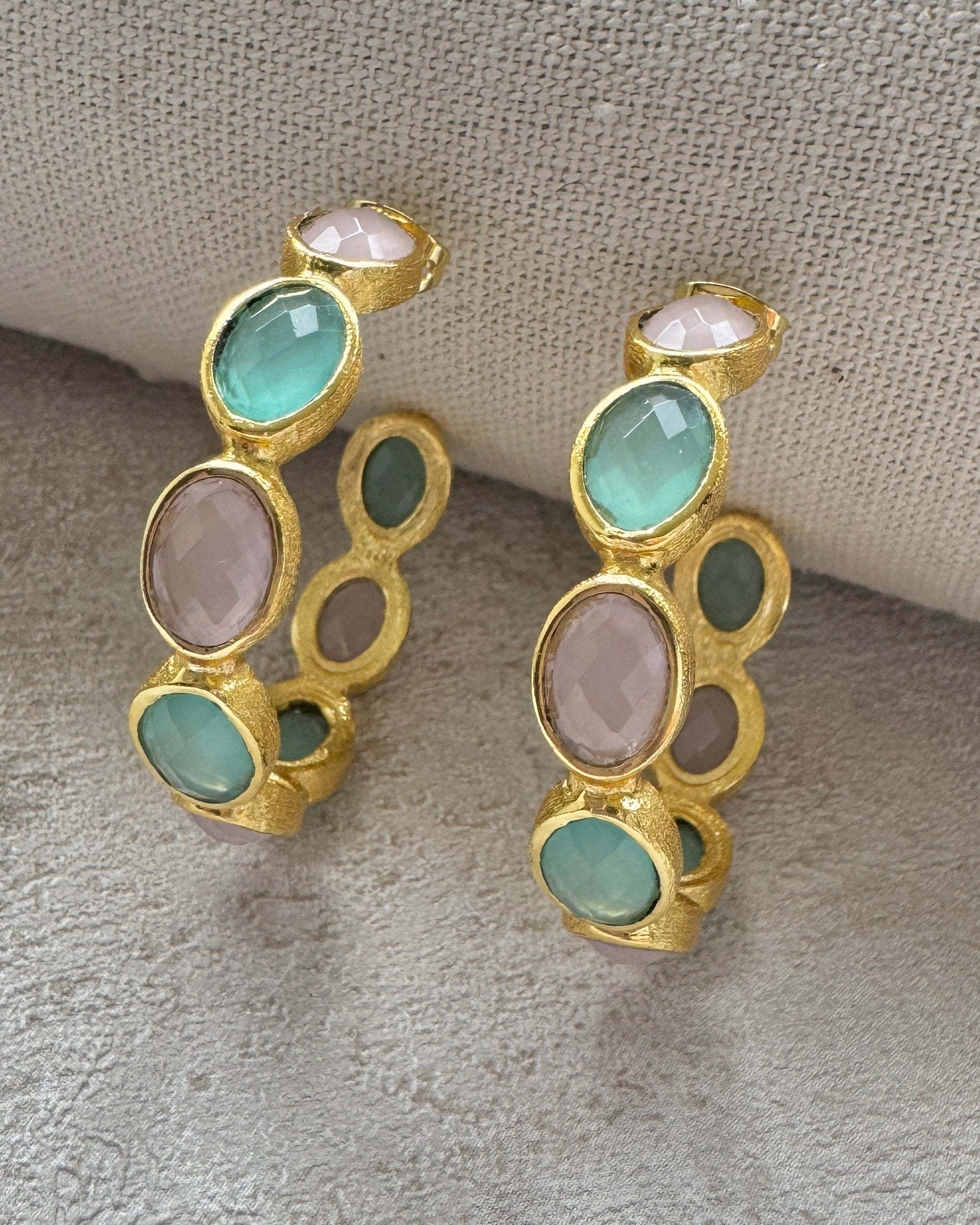 Make a bold statement with these gold-plated, lightweight chunky hoops, featuring an eye-catching mix of oval-shaped rose quartz and amazonite beads.