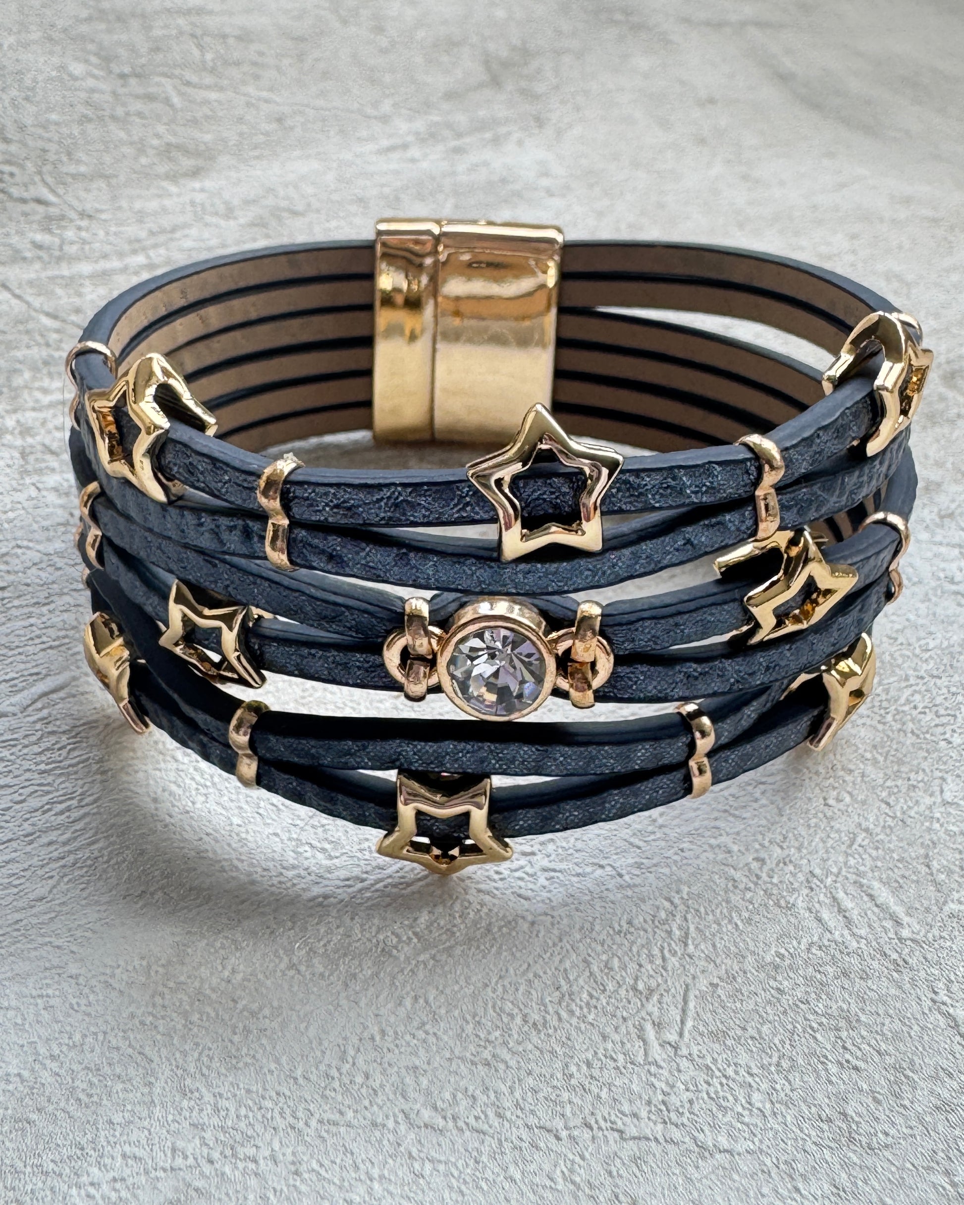 Stacked style, simplified. The Starlight Boho Cuff gives you the look of layered bracelets in one easy piece. Crafted from leather strips with delicate gold cut-out stars, it’s finished with a secure magnetic clasp for effortless wear.